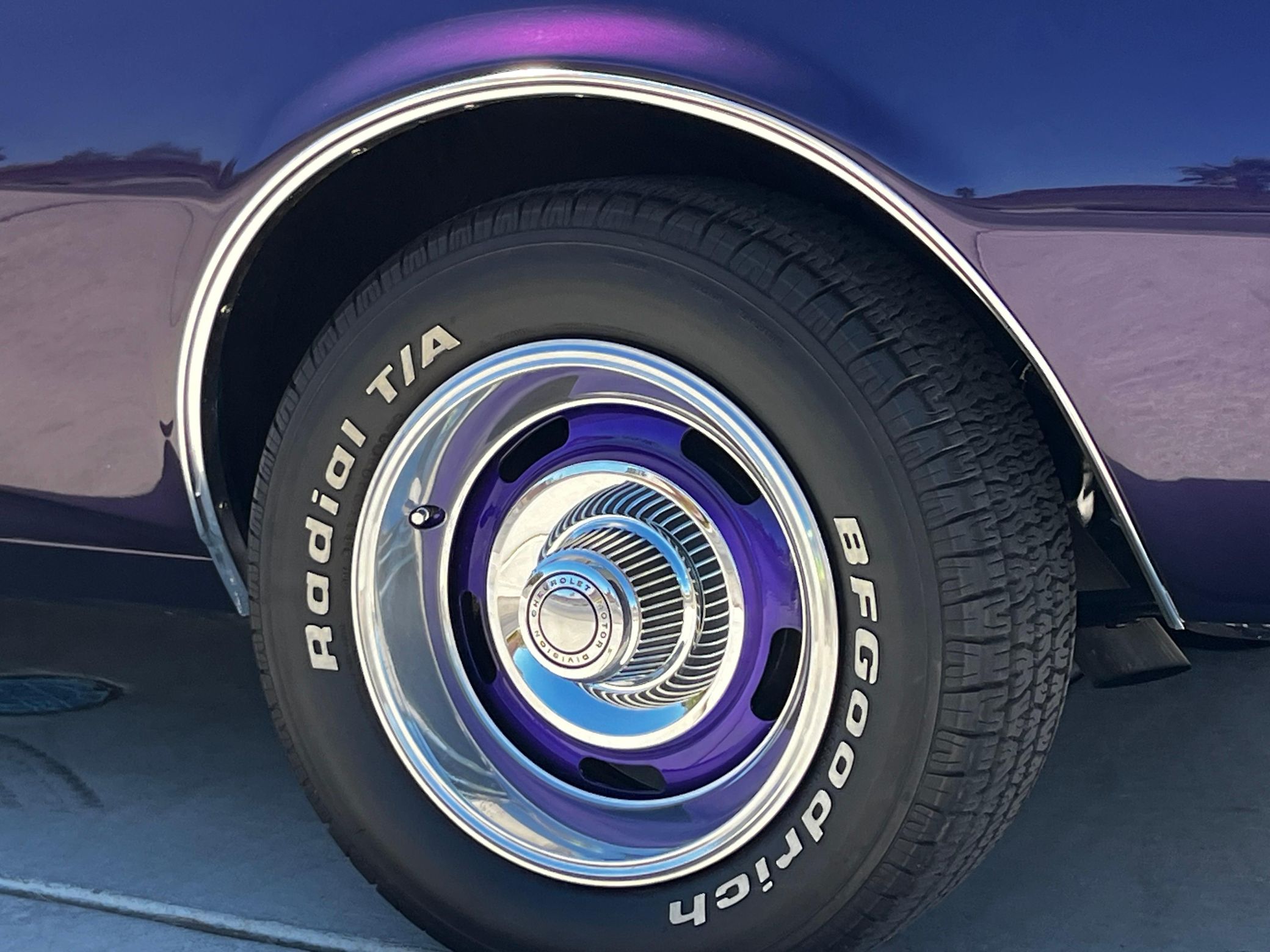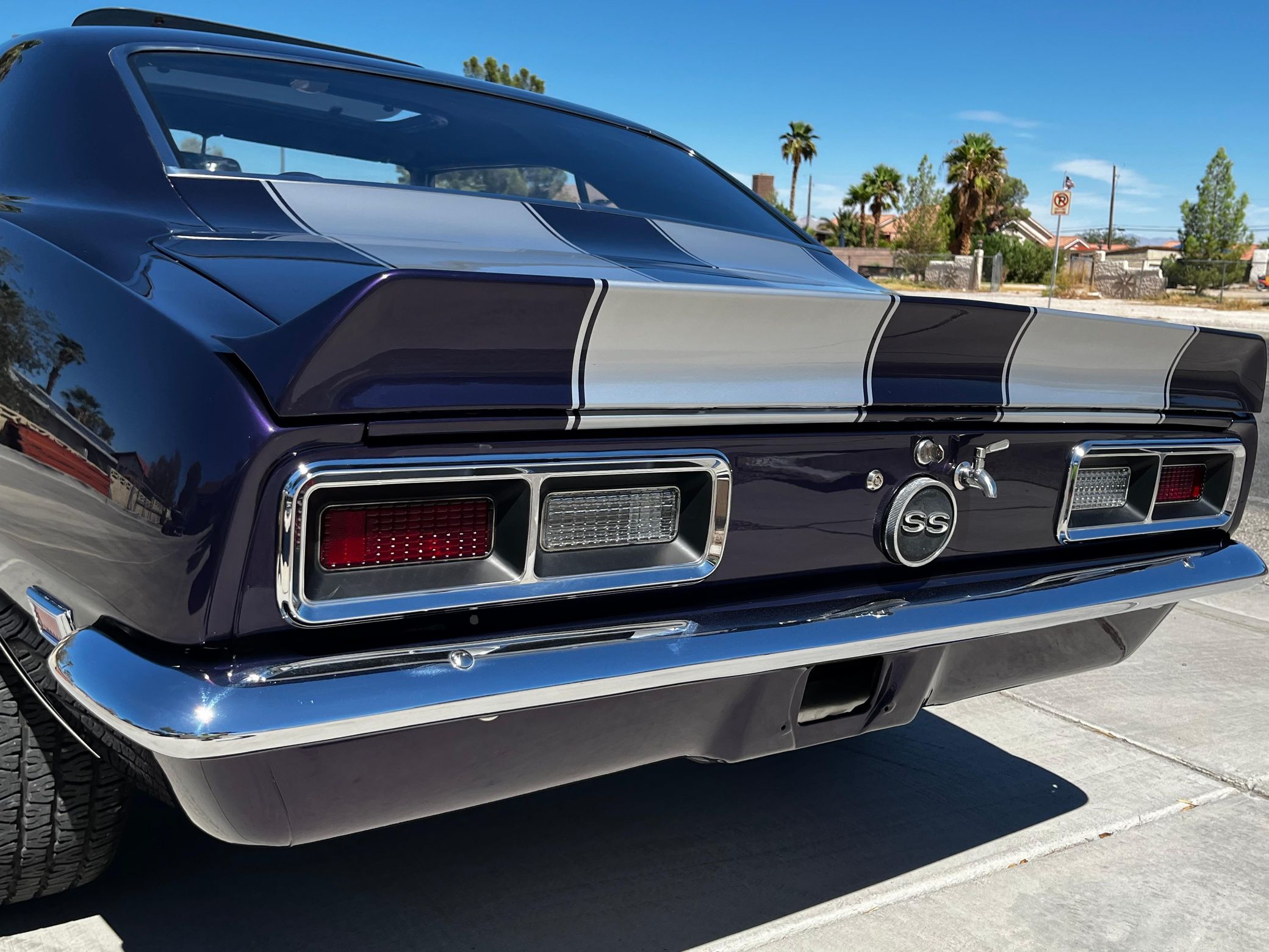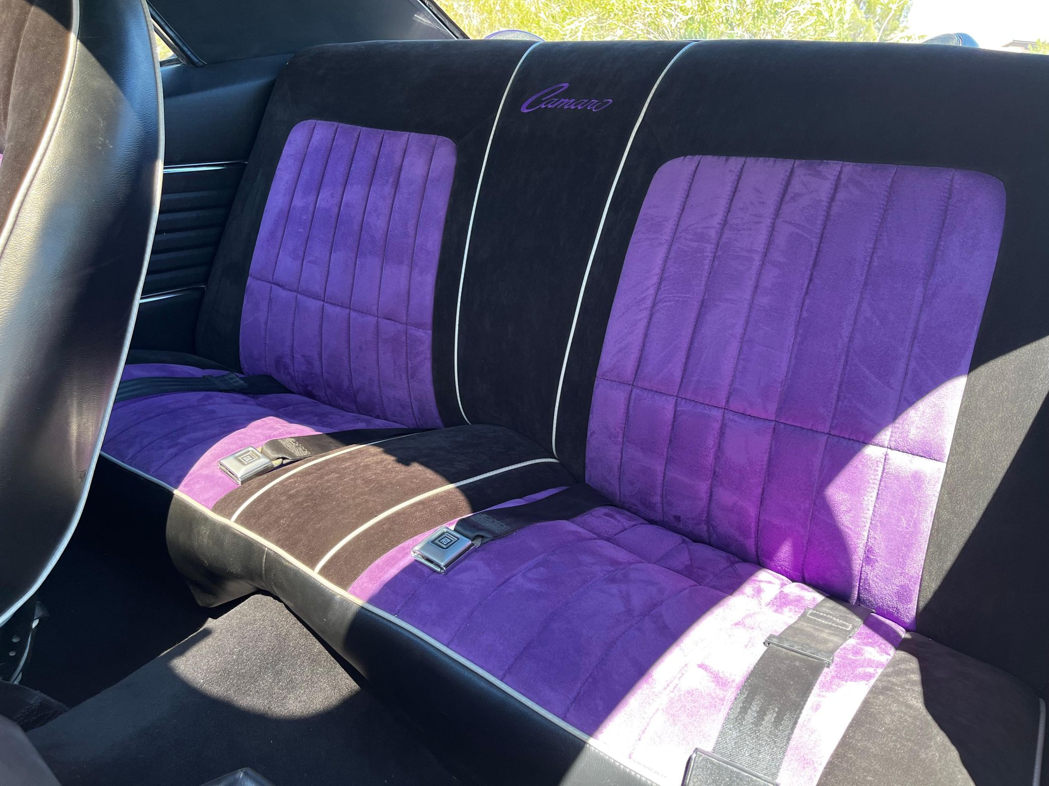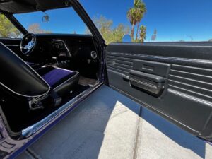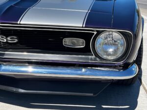 This 1968 Chevrolet Camaro Coupe is finished in a custom purple and silver two-tone exterior over a black and purple interior. It is reported to have undergone a body-off restoration and remains in excellent driving condition.